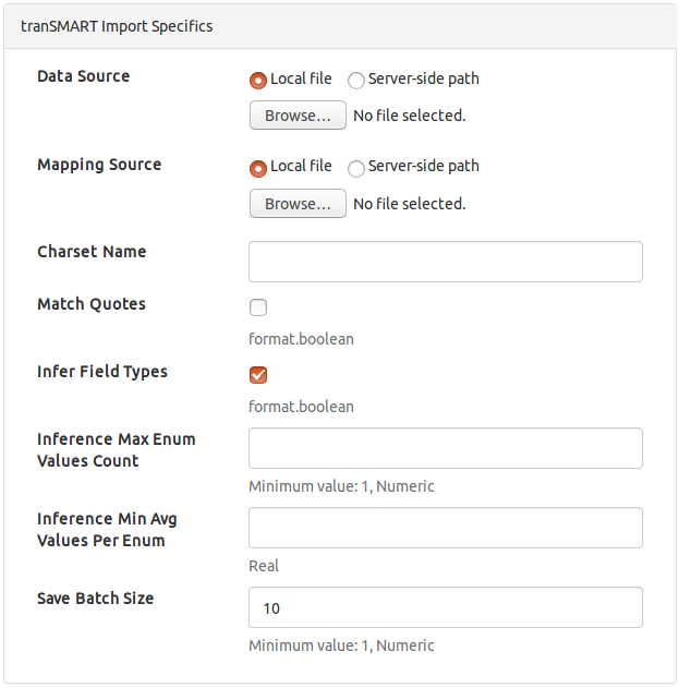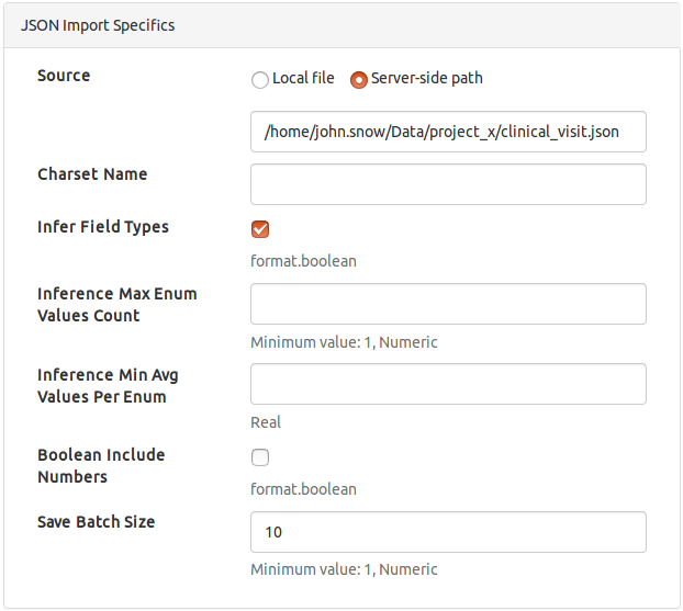 - Source is either local (uploaded by an admin through the browser) or server-stored, in which case a path needs to be provided. Note that once a data set import is created a local file (if specified) is uploaded to the Ada server and the type is switched automatically to server-side.