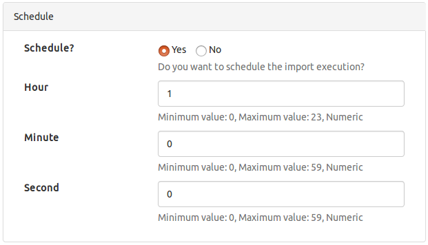 In the schedule example of the right an import is set to be executed every day at 1am. Note that if scheduling is desired Yes must be checked (defaults to No).