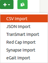 To create, edit, delete, schedule, or execute a data set import, go to Admin→Data Set Imports. Ada currently provides six data import adapters, three file-based: CSV, JSON, and tranSMART; and three RESTful-based: REDCap, Synapse, and eGaIT.